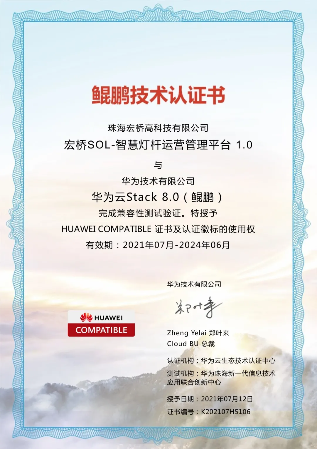 宏橋高科技集團(tuán)有限公司作為珠海第一批參加鯤鵬凌云伙伴計(jì)劃的公司,在7月初完成宏橋SOL-智慧燈桿運(yùn)營(yíng)管理平臺(tái) 1.0與鯤鵬云服務(wù)、華為云Stack 8.0(鯤鵬)兼容性測(cè)試驗(yàn)證,獲得鯤鵬技術(shù)認(rèn)證證書(shū),成為鯤鵬凌云伙伴。