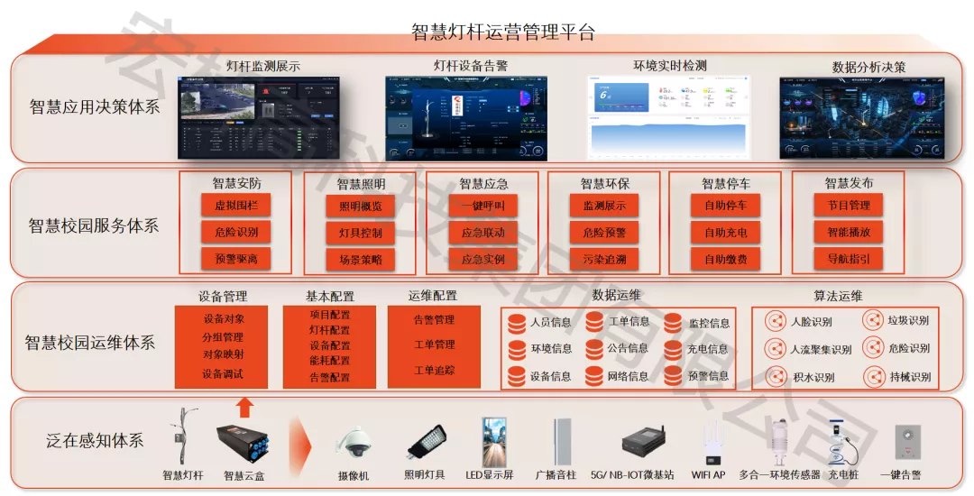 為有效解決校園安全隱患,提升校園管理效率,打造安全、高效、降本的智慧校園,宏橋高科集團(tuán)以智慧燈桿為物聯(lián)載體,配套智慧燈桿運(yùn)營(yíng)管理平臺(tái),建立包含泛在感知體系、智慧校園運(yùn)維體系、智慧校園服務(wù)體系、智慧應(yīng)用決策體系四大體系的校園技防體系。
