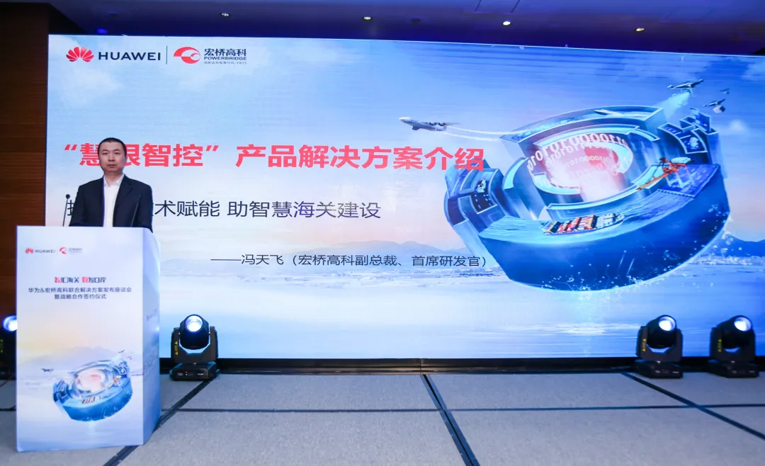 宏橋高科副總裁、首席研發(fā)官馮天飛在現(xiàn)場(chǎng)介紹了智慧海關(guān)——慧眼智控海關(guān)監(jiān)管智慧平臺(tái)。