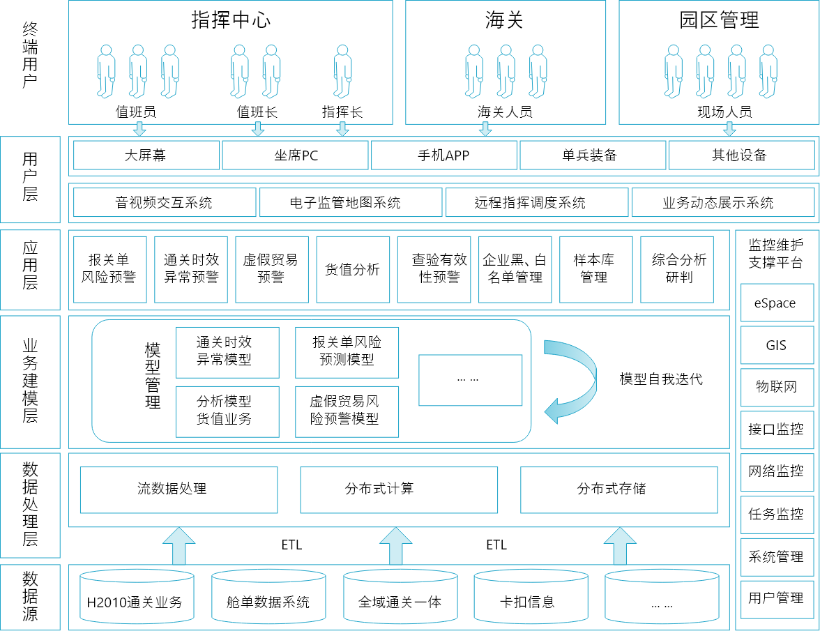 智慧海關(guān)監(jiān)控指揮中心是面向海關(guān)監(jiān)管的應用系統(tǒng),采用大數(shù)據(jù)技術(shù)、多媒體技術(shù)、地理信息技術(shù)和融合通信技術(shù),圍繞海關(guān)監(jiān)管,構(gòu)建現(xiàn)代化的監(jiān)控指揮體系。通過對業(yè)務(wù)現(xiàn)場的各類信息進行分析、處理、存儲和展示,使管理機構(gòu)能及時掌握口岸業(yè)務(wù)最新動態(tài);通過多媒體交互實現(xiàn)對業(yè)務(wù)現(xiàn)場的通關(guān)查驗工作、對突發(fā)事件的防控處置的實時監(jiān)控指揮。通過對各種信息的采集、分析,運用大數(shù)據(jù)技術(shù)構(gòu)建有效風險防控與預警體系。智慧海關(guān)監(jiān)控指揮中心系統(tǒng)創(chuàng)新監(jiān)管服務(wù)、構(gòu)建新型的業(yè)務(wù)應用提供數(shù)據(jù)支撐與管控。